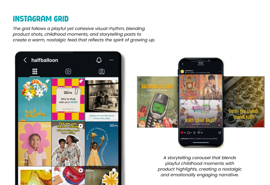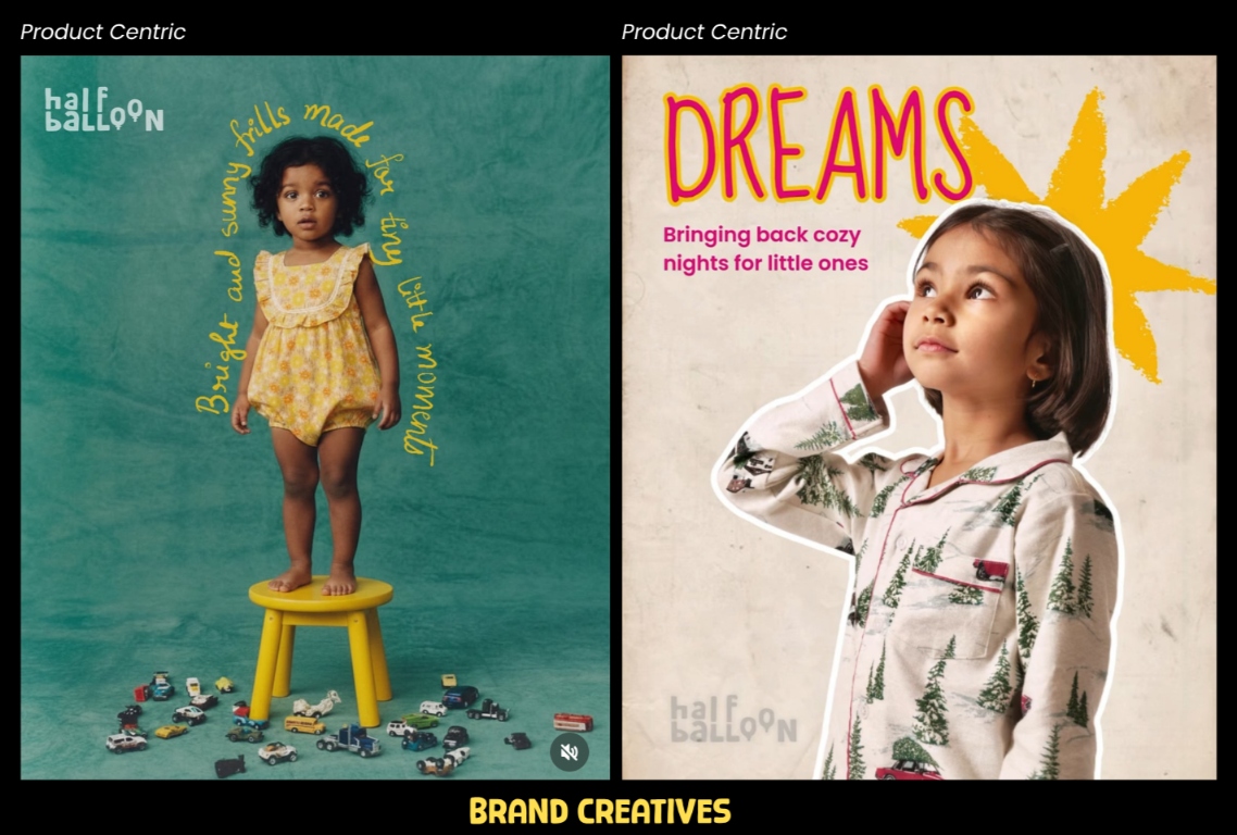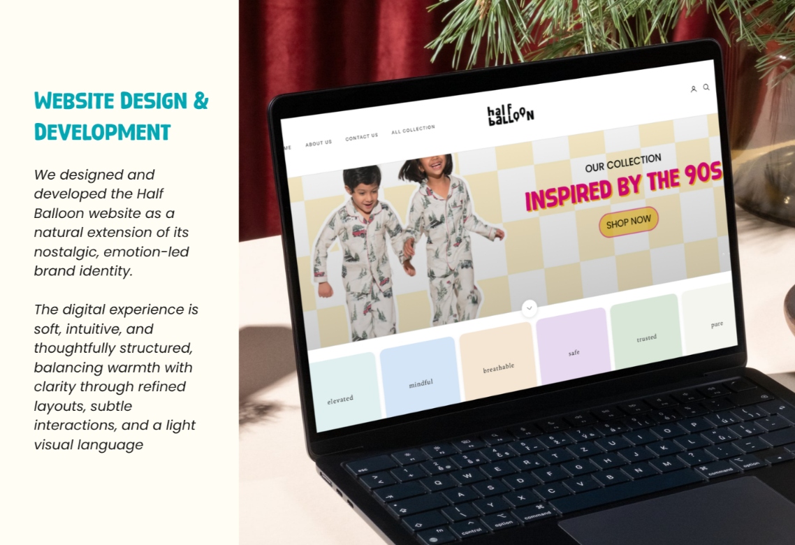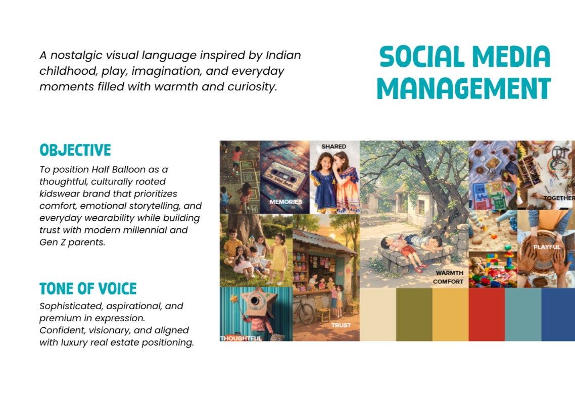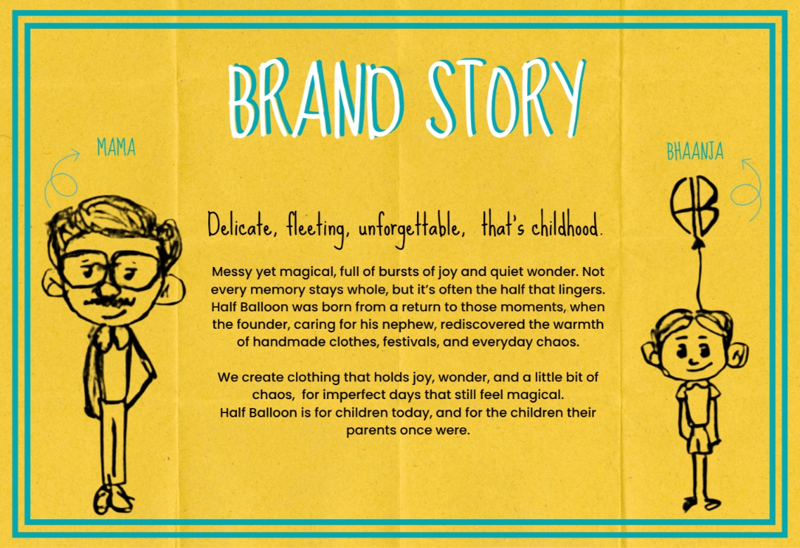We developed a thoughtful brand identity and communication direction for Half Balloon that reflects its milestone-based kidswear concept, Indian cultural roots, and emotional connection with modern caregivers, while highlighting comfort, storytelling, and nostalgia in early childhood.