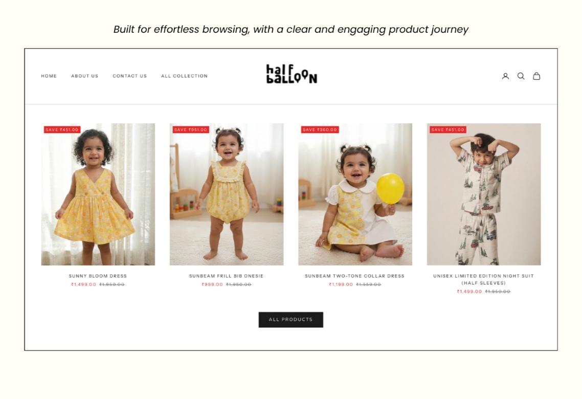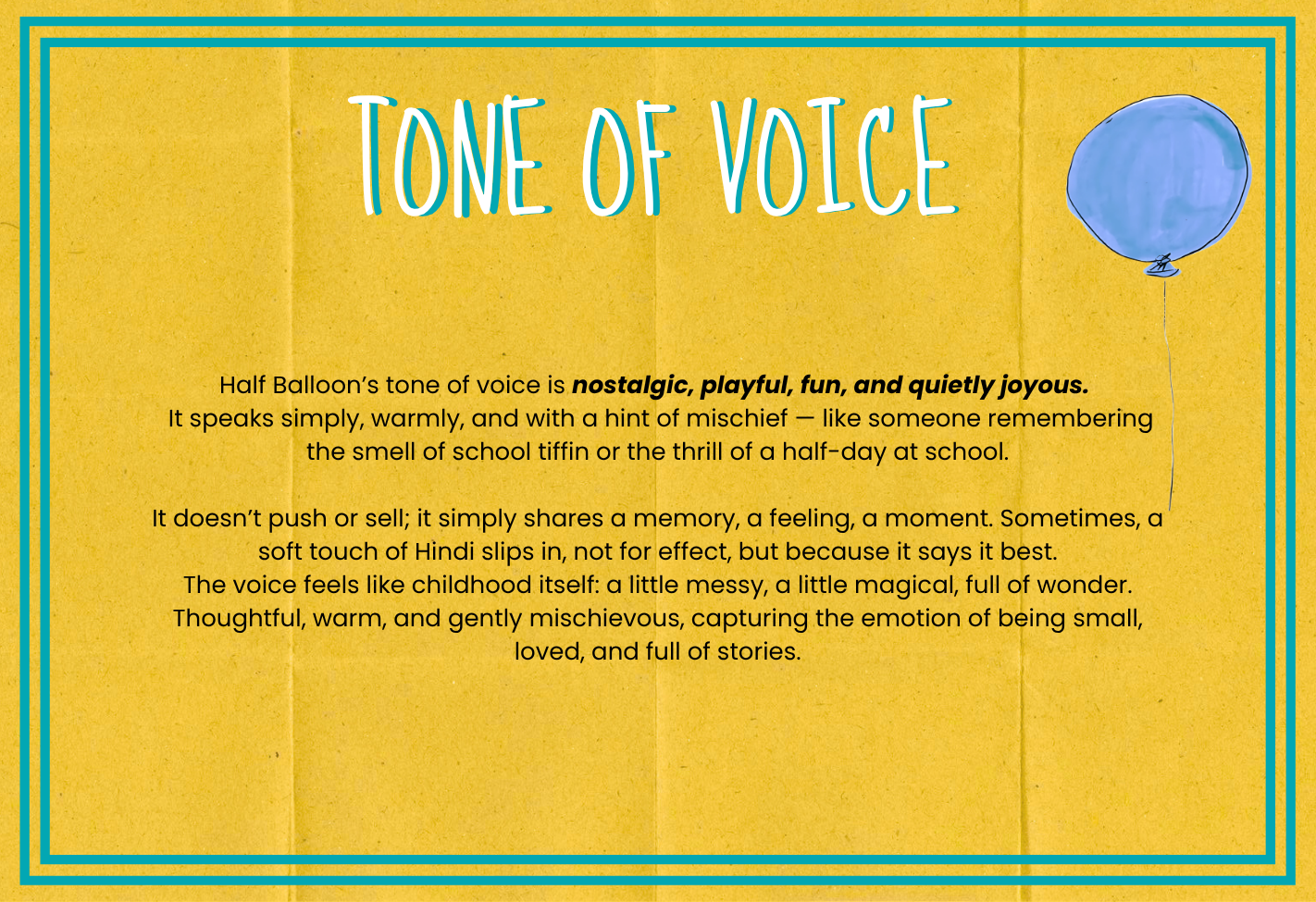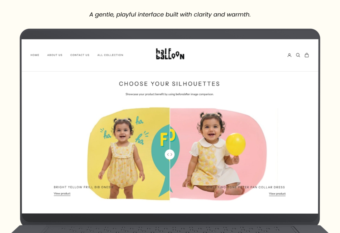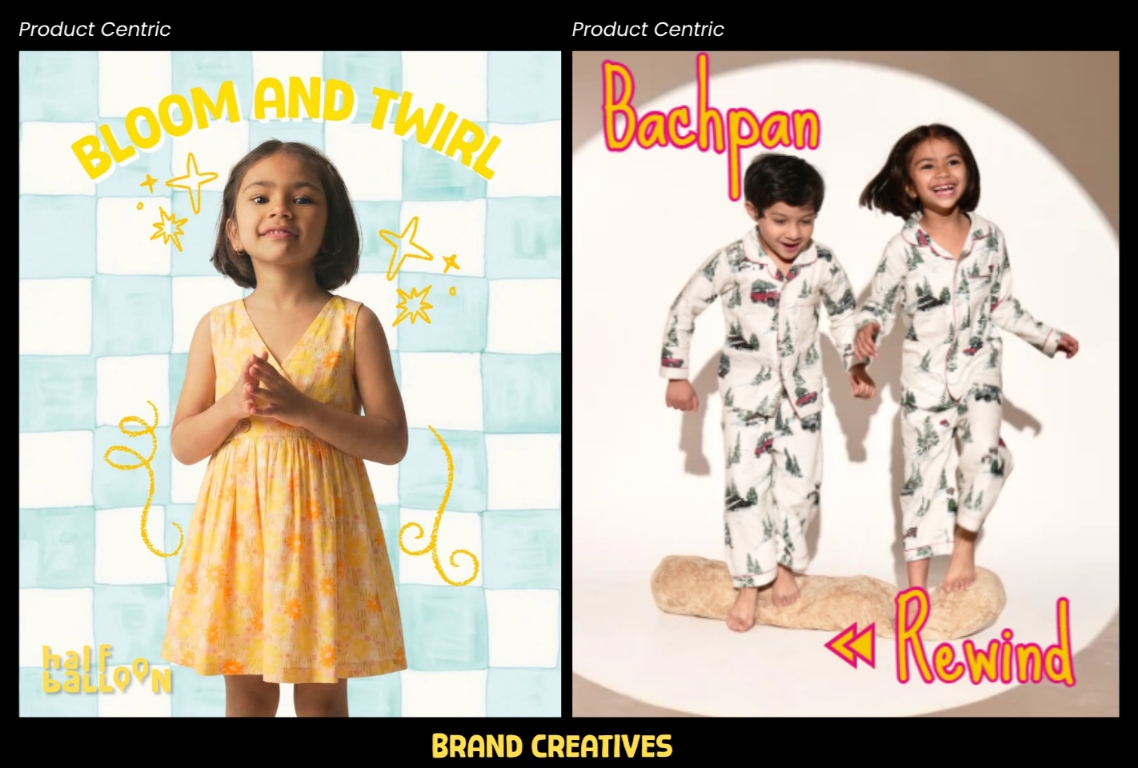 We developed a thoughtful brand identity and communication direction for Half Balloon that reflects its milestone-based kidswear concept, Indian cultural roots, and emotional connection with modern caregivers, while highlighting comfort, storytelling, and nostalgia in early childhood.